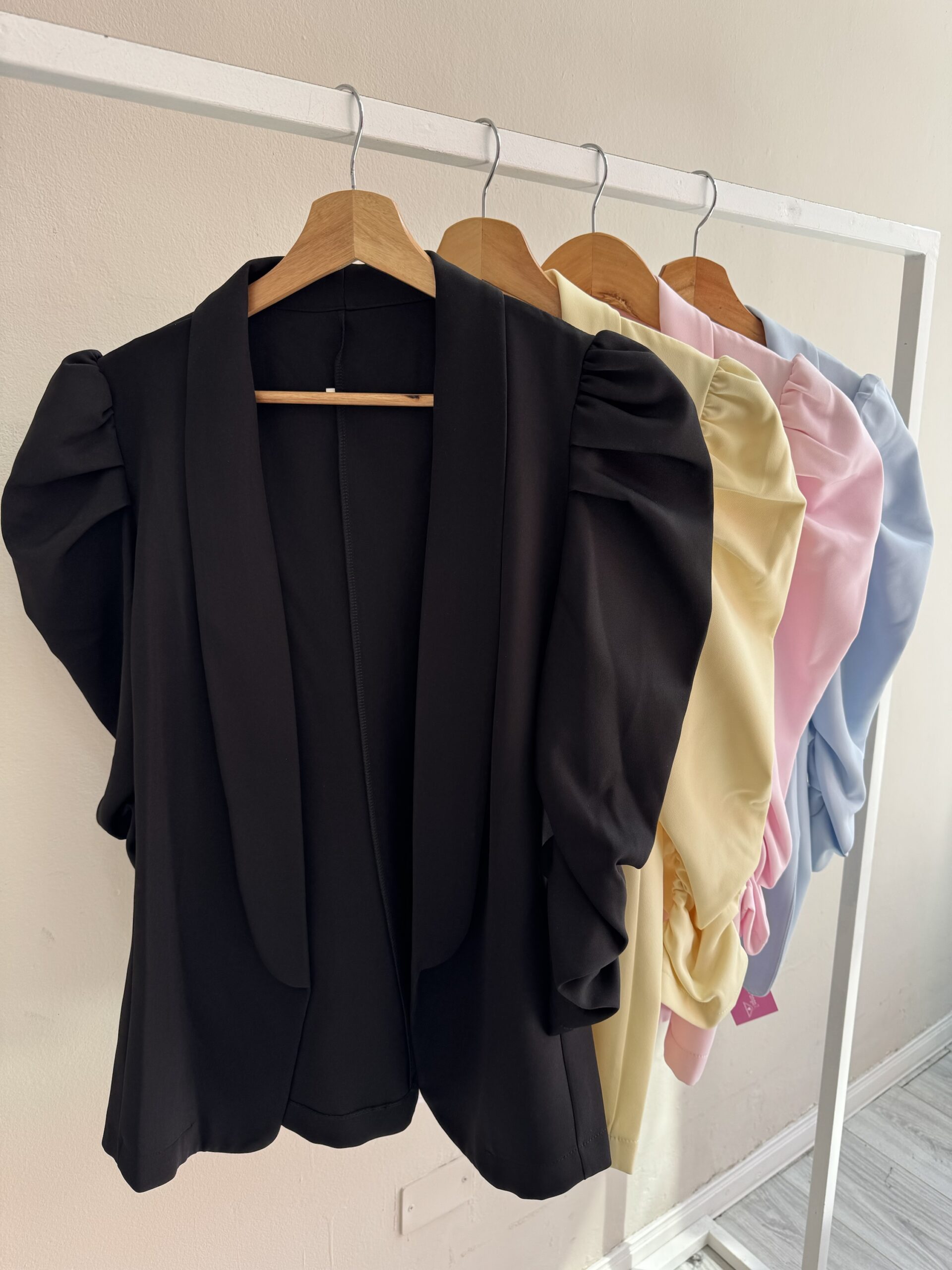 Blazer sastrero con manga 3/8 frunce y hombros princesa.