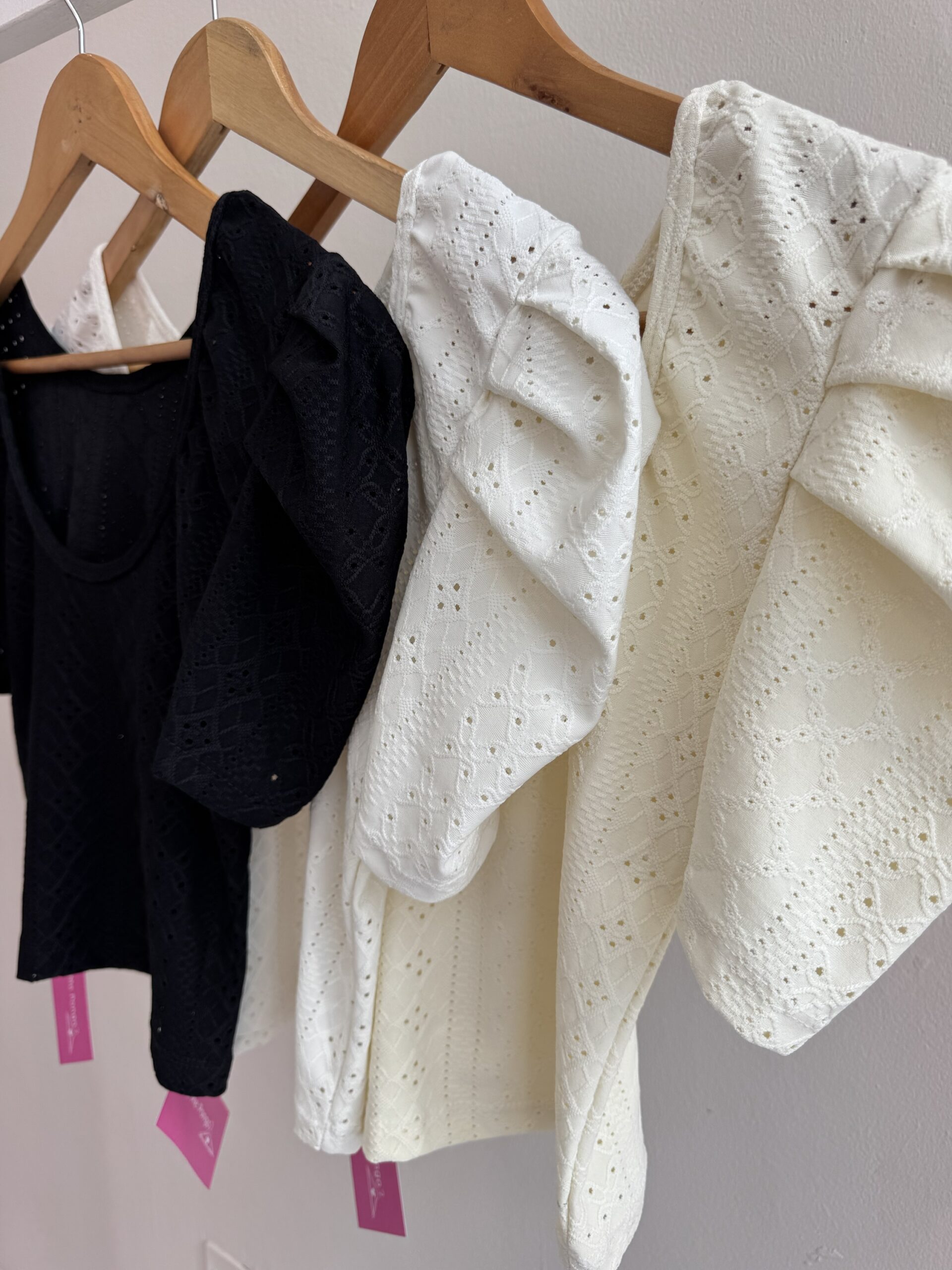 Blusa corta de broderie microfibra, elastizada. Adapta hasta talle 2.