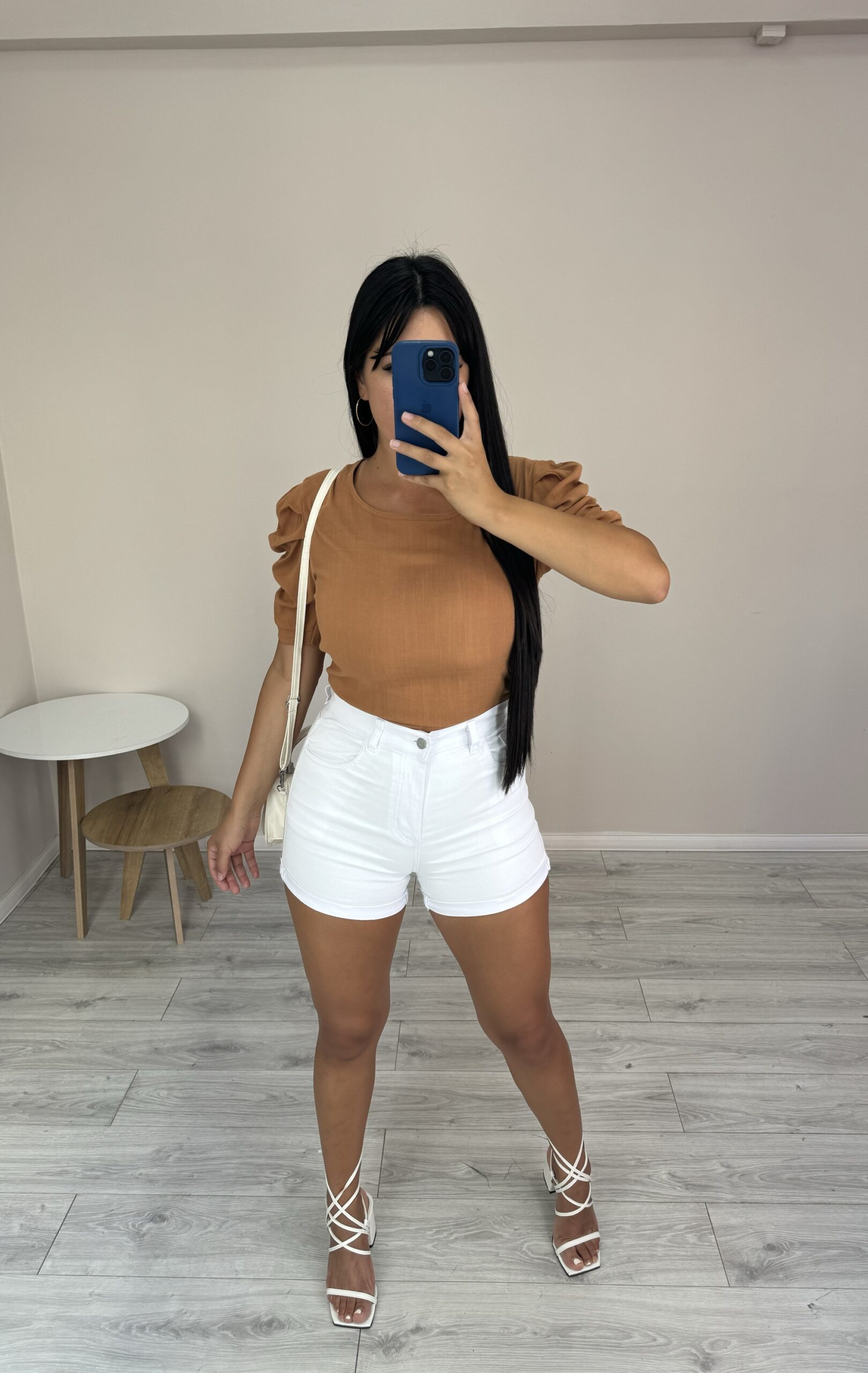 Blusa de lino semi elastizado, hombros princesa, espalda abierta.