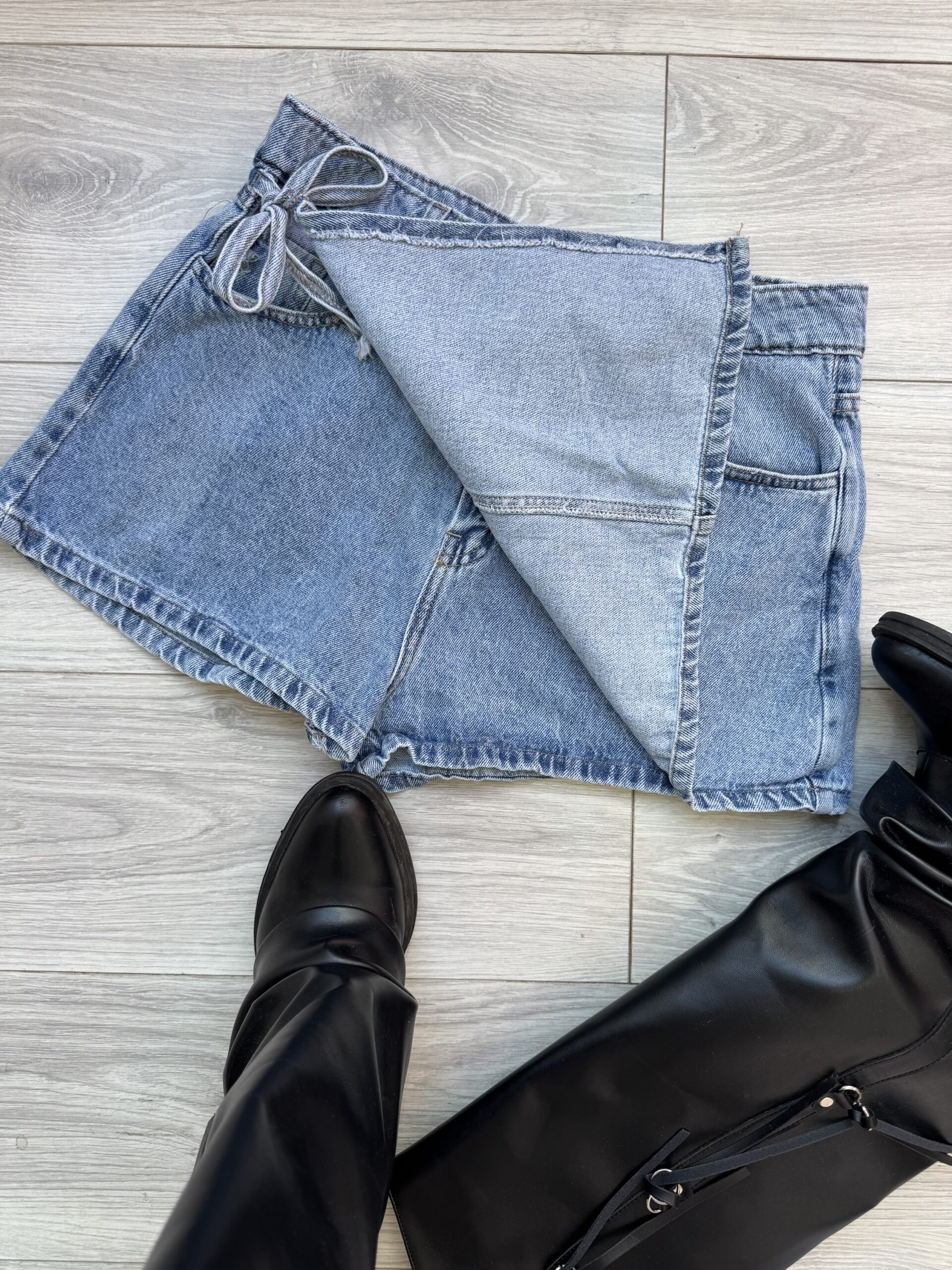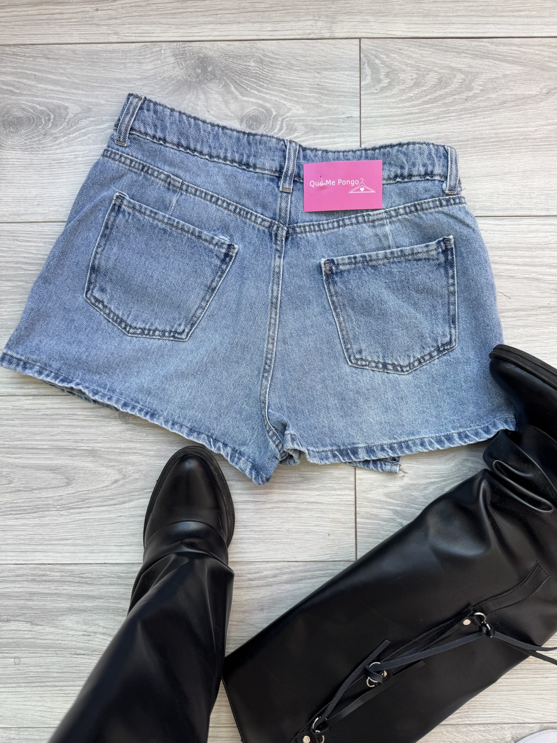 Short pollera de Jean rígido. Tiro alto.